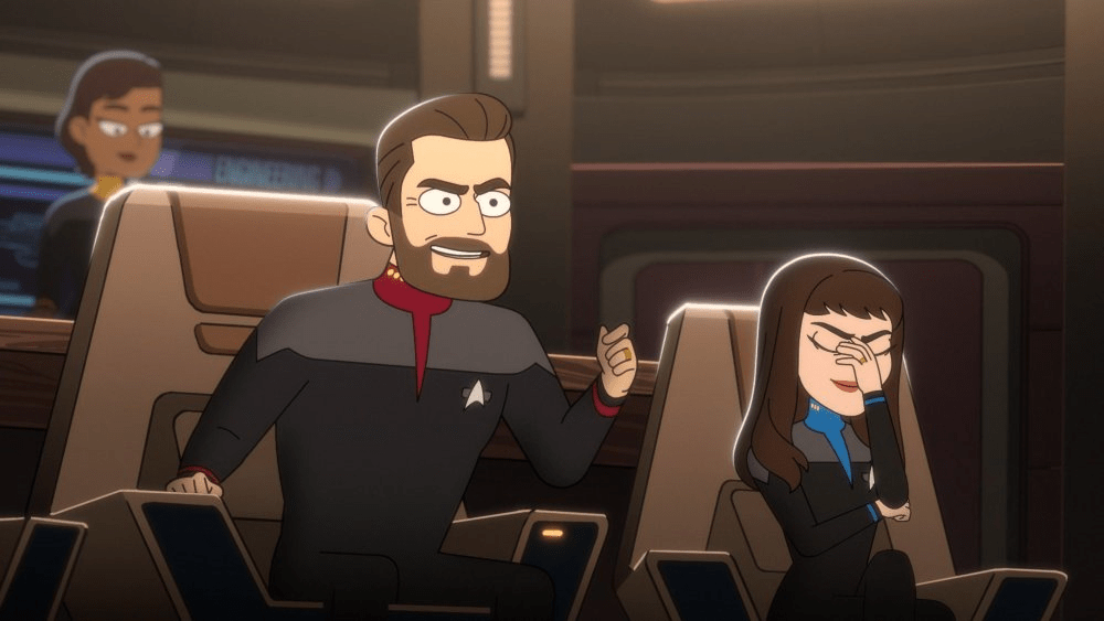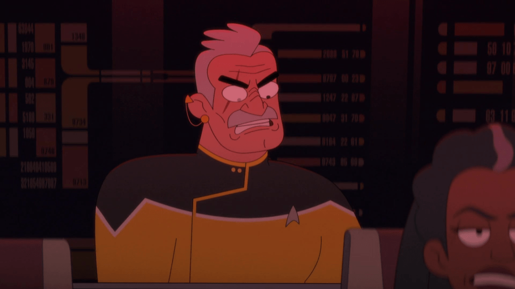 Lower Decks, on the other hand, is an intentional parody … or at least, that’s part of what it is. It’s also a new installment of Star Trek itself, and a unique opportunity for the franchise to re-examine itself – both through the heightened reality of animation, and through the sort of self-aware and self-referential humor that creator Mike McMahan’s previous creation, Rick and Morty, was already well known for. (Yes, a very vocal subset of Rick and Morty’s fan base might be described as anything but self-aware, but I don’t think the same can fairly be said about the show itself, which, for example, clearly understood that Rick’s selfish obsession with a stupid dipping sauce was unhealthy and inhumane, even if those particular fans made a point of missing that point.) Lower Decks’ premier episode, “Second Contact,” set its first season on course for that sort of reflection on the past and present of Star Trek, tasking the crew of the USS Cerritos with revisiting new worlds after first contact, to dot the Federation’s i’s and cross its t’s in a way we rarely, if ever, saw done by Kirk’s or Picard’s Enterprises, or by Janeway’s Voyager, for that matter. It’s a premise with clear comedic potential, obviously, but it also allows Star Trek the chance to semi-seriously revisit the record of blind spots it has accrued over the last half-century. And from literally its opening moments, the first season finale, “No Small Parts,” is very upfront about those blind spots, and about their in-universe implications. We join the crew on Beta III, the setting of the Original Series episode “The Return of the Archons,” one of several episodes in which Captain Kirk famously outsmarts a super-computer, setting the planet’s inhabitants free in the process. But we find ourselves on Beta III for more than just one of Lower Decks’ signature call-backs to earlier Trek; those inhabitants, we learn, have opted to go back to blindly following a super-computer, because it turns out that a single action on Kirk’s part, however well-meaning and/or irresponsibly drastic that action might have been, was not, in itself, enough to right the course of an entire civilization. Similarly, Starfleet is caught off guard by the Pakleds, who have leveled up from snaring good Samaritans to destroying Federation starships, because it seemingly never occurred to them that the Pakleds might “develop,” as Riker put it, beyond the joke they appeared to be in their encounter with the Enterprise D, or that that encounter, itself, might change the course of their “development” in unexpected, unintended ways; after all, the Solvang and the Cerritos, which the Pakleds call “Enterprises,” might never have come under attack if the Pakleds hadn’t been left with something to prove to the actual Enterprise.