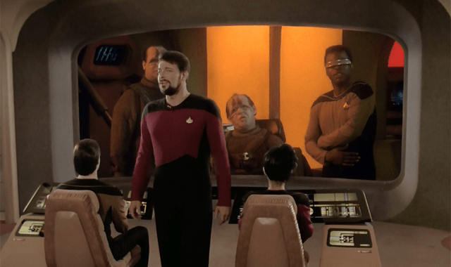 Put simply, the Pakleds are introduced to us in “Samaritan Snare” as an entire species of stupid people that somehow made it into space. At best, this feels implausible, to say the least; even once we learn that the Pakleds have cobbled their ship together from other species’ stolen technology, just making all those technologies work together under one ship’s computer system sounds like a pretty sophisticated feat of engineering in and of itself (something we would see addressed, decades later, when the Pakleds were revisited by Lower Decks in the much better episode “No Small Parts,” which we’ll get to below). “Samaritan Snare” gestures at addressing this, with Data first conjecturing that the Pakleds may have “poorly developed language skills,” and Riker later telling them directly, “I think you need to continue to develop.” But this only leads us in an even worse direction, as it’s implied that humanity’s social and technological progress is a linear, universal blueprint against which any species can be measured (a line of thinking Star Trek itself had already argued against, going out of its way to introduce a post-apocalyptic period into humanity’s future history which serves as a reminder that society doesn’t automatically get better over time, and that technological progress can be destructive just as easily as it can be productive, depending on the choices we make as a society). On top of this implication that we can determine the intelligence of a people by comparing their technology to ours, the appearance of the Pakleds, while very well done on the technical level of makeup and prosthetics, leans equally hard into the equally troubling (and very non-Star Trek-like) notion that intelligence might be judged by appearance. Literally every last Pakled we see here is heavyset with a receding hairline and enormous eyebrows, in an insulting caricature of what “stupid” looks like. Homogenous alien species are a long-standing Star Trek trope, but the Pakleds push that tendency to such absurd extremes that “Samaritan Snare” ends up feeling like an accidental parody of Star Trek.