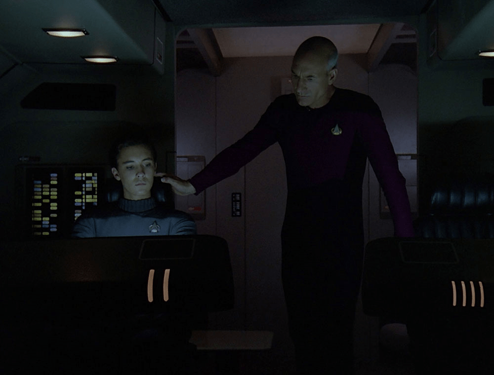 But explorations of that tension are, again, not entirely new to Star Trek, as we can see in the best scene from “Samaritan Snare,” by far the best reason to watch that episode. During their initially uncomfortable shuttle ride to a starbase, Captain Picard tells Wesley Crusher a story which we would later see play out in real time (sort of) in the episode “Tapestry”: the story of how a bar fight left a cocky young Jean-Luc with the artificial heart he now needs replaced. At first, in “Samaritan Snare,” Picard’s impulse to hide his heart surgery from the crew, out of an apparent need to appear invulnerable in the eyes of his crew, feels like an artifact of those first- and second-season growing pains, as The Next Generation struggled to update the decades-old ideas on leadership it had inherited from The Original Series, and to refine its crankier, more stereotypically patriarchal Picard into the character familiar from later seasons as the very definition of humane, thoughtful leadership for a generation (at least) of Trek fans. But when this version of the character lets his guard down with Wesley, he reveals another possible reason for hiding his condition, one more in line with who Picard would come to be in later seasons. He sees the behavior that earned him his artificial heart as setting a poor example for how Starfleet officers should comport themselves, making his sharing of the story with Wesley all the more mechanical-heart-warming, and all the more significant to their developing, semi-parental relationship. And yet, it’s at least implied here (and made explicit in “Tapestry”) that Picard sees this moment from his past, as undignified and unbecoming of a Starfleet officer as it may be, as an important point in his own development as a Starfleet officer – one he seems to believe (and Q later confirms) he couldn’t have reached via by-the-book training alone. And while he hopes Wesley can find a less “painful” way of learning his own lessons, Picard still clearly sees, and assures Wesley of, Starfleet’s need for officers who have learned lessons outside its own institutional framework:
